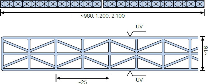 A 16 mm-es lemezek esetén standard belső szerkezet kiváló terhelhetőséget, jó hőszigetelő képességet és időjárásállóságot biztosítanak, miközben a lemezek fényáteresztő képessége magas marad. A lemezek (a speciális IQ Relax és CC zöld színek kivételével) mindkét oldalukon UV védettek.